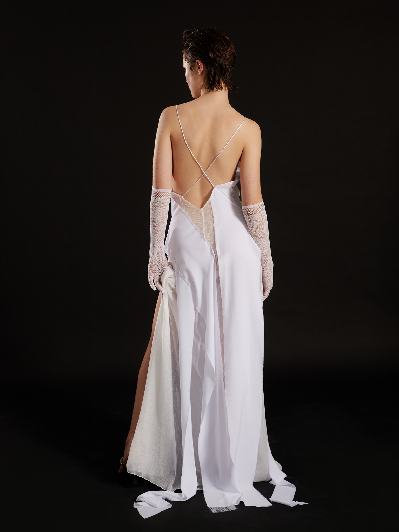 Long white dress in transparent chiffon with extra long crêpe fabric straps placed in strategic areas of the body