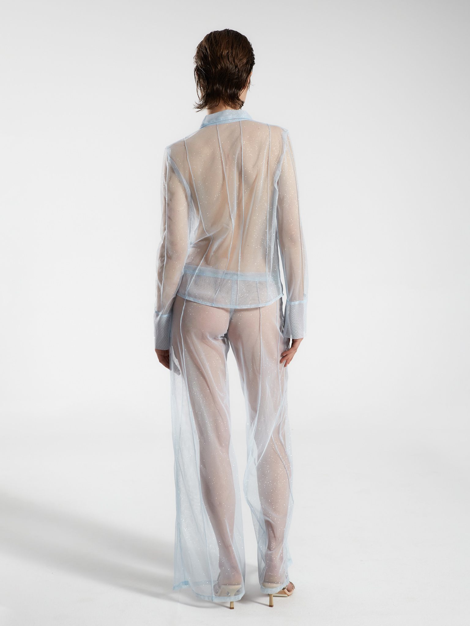 The Rocio shirt is made with a translucent mesh with small silver sparkles that create a shimmering effect on the skin