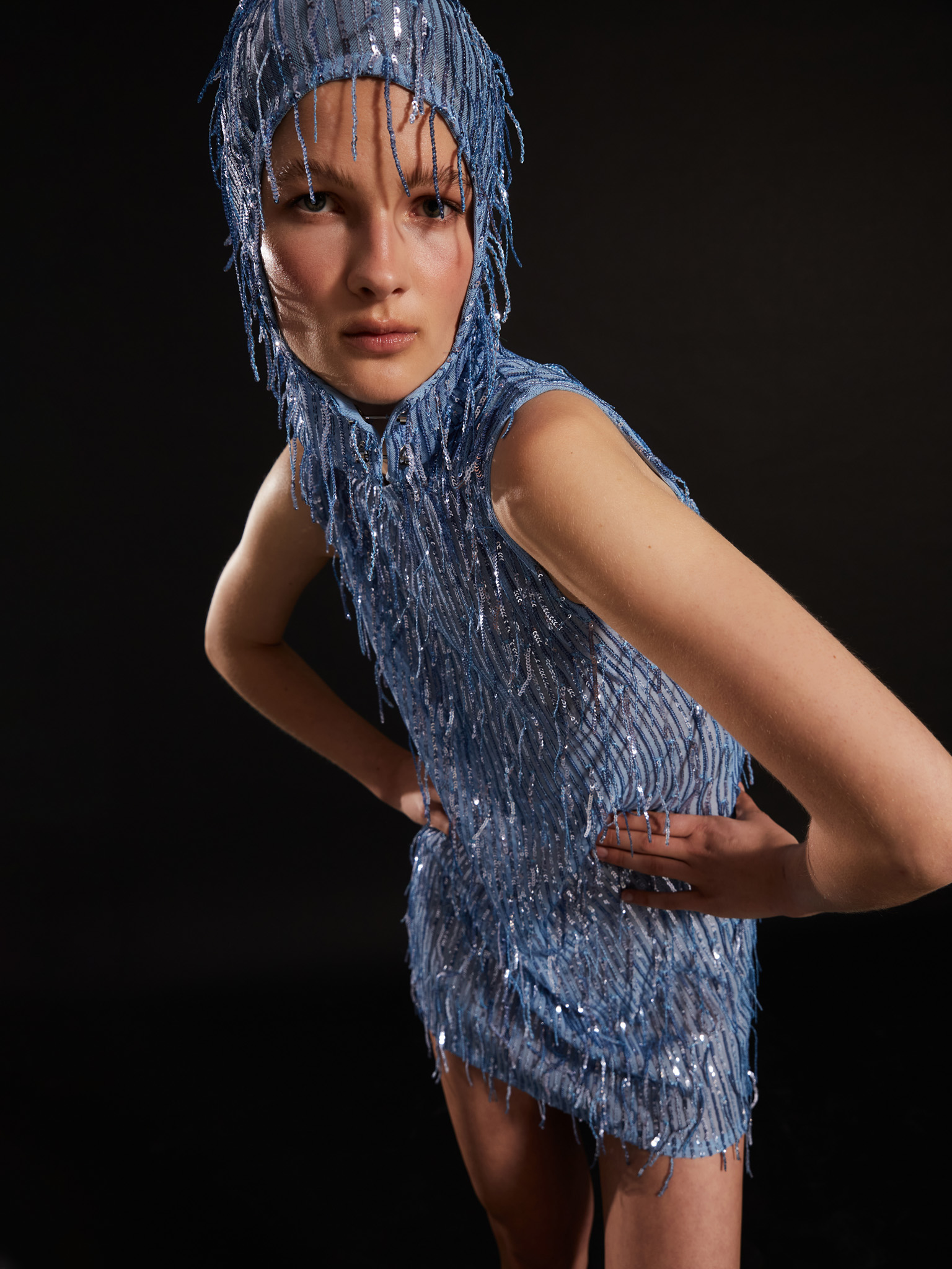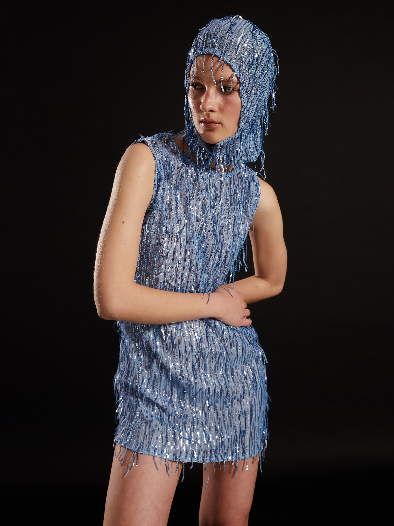 Wisteria mini-dress, round neck, sleeveless, made in blue elastic tulle with sequins and pendants of the dress